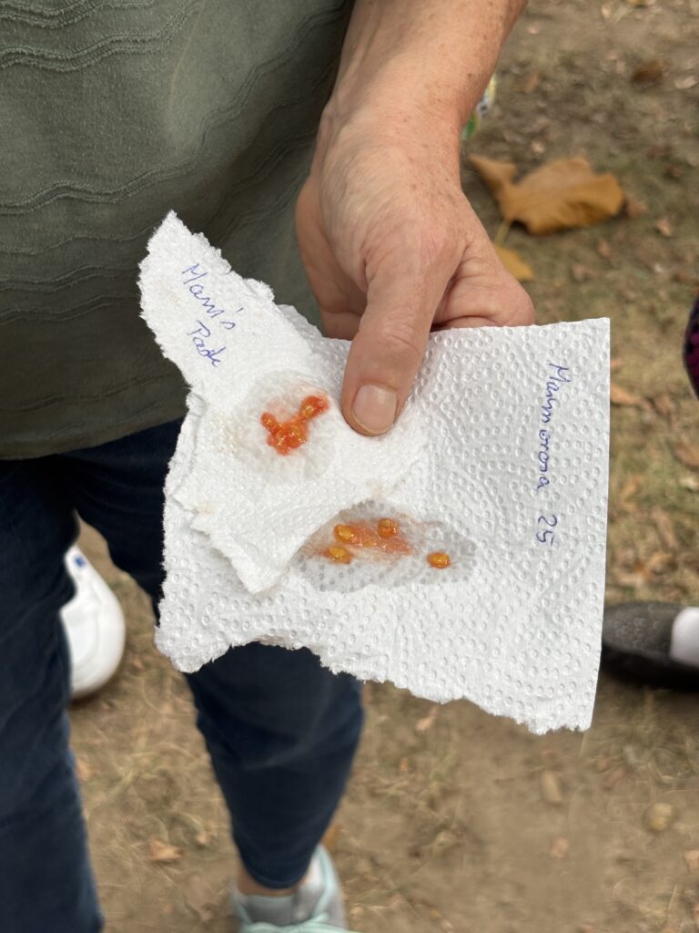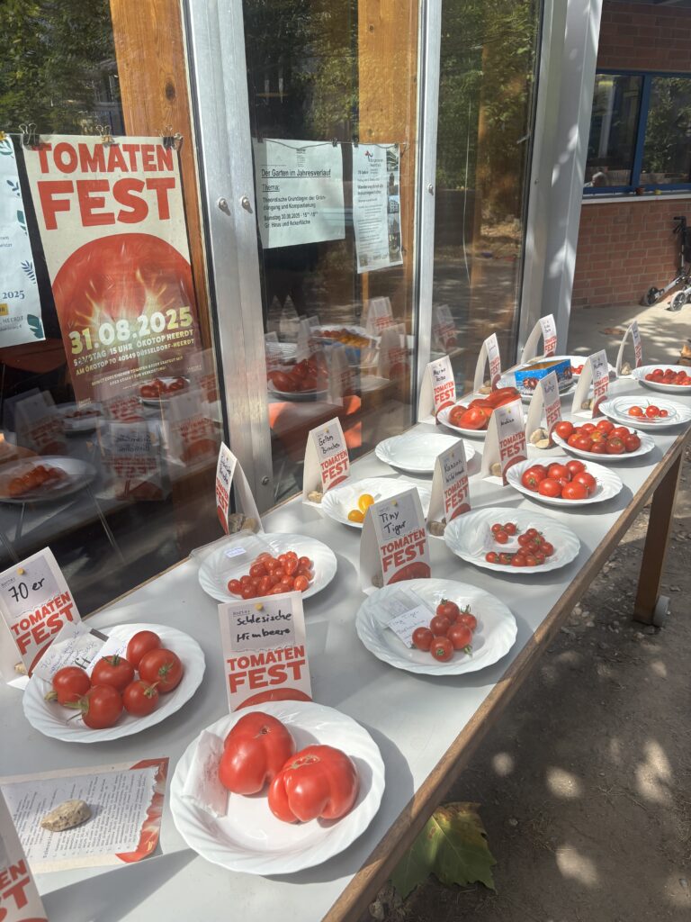 Am Sonntag, dem 31. August 2025, war es dann soweit, und es kamen mehr als 100 Menschen in‘s Ökotop Heerdt, von denen viele Tomaten aus ihrem Garten mitgebracht haben. Wir hatten Brot, Mozzarella und Basilikum besorgt, es gab Kaffee, Kuchen und Apfelsaft, ein Mitglied hatte Ketchup gekocht, und alle konnten die zahlreichen Tomaten probieren. Wir hatten Küchenkrepp in kleinere Stücke geschnitten, so dass alle, denen eine Tomate besonders gut geschmeckt hatte, sich deren Samen auf’s Papier kleben und mitnehmen konnten, um diese Sorte dann zu Hause anbauen zu können. Wir hatten Schilder drucken lassen, auf die wir dann die Namen der einzelnen Tomatensorten schreiben konnten, und hinterher haben wir gezählt: wir hatten 43 samenfeste Sorten mitgebracht bekommen und freuen uns darauf, nächstes Jahr am 30.8.2026 das zweite Tomatenfest im Ökotop feiern zu dürfen. Alle, die dieses Jahr dabei waren, und alle, die eigene Tomaten schon seit Jahren in ihren Gärten anbauen, sind herzlich eingeladen, an diesem Tag ihre Schätze mit allen zu teilen!