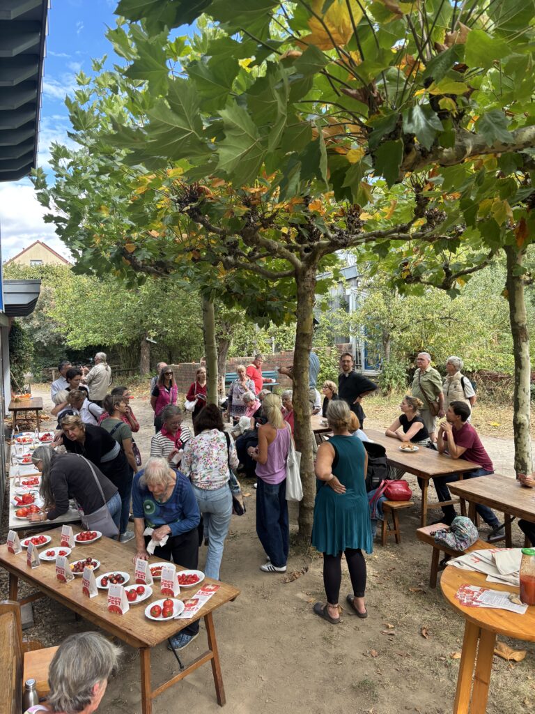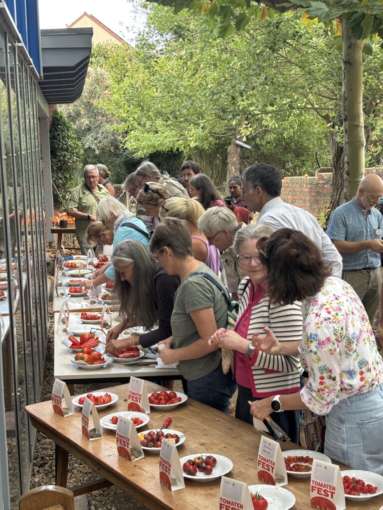 Im August 2024 haben wir mit mehreren Mitgliedern des Ökotop Heerdt und der Saatgutinitiative Düsseldorf eine Tomatenverkostung organisiert. Wir wollten erste Erfahrungen mit einer solchen Veranstaltung sammeln, um dann für den folgenden Sommer die ganze Stadtgesellschaft einzubinden. Im Januar-grünstift 2025 haben wir dann alle Interessierten eingeladen, eine Patenschaft für einzelne Tomatensorten zu übernehmen und sich das nötige Saatgut an unserem Stand auf dem Saatgutfestival am 8.3.2025 abzuholen. Viele Menschen haben diese Einladung angenommen, so dass wir hinterher rund 40 Emailadressen eingesammelt hatten.